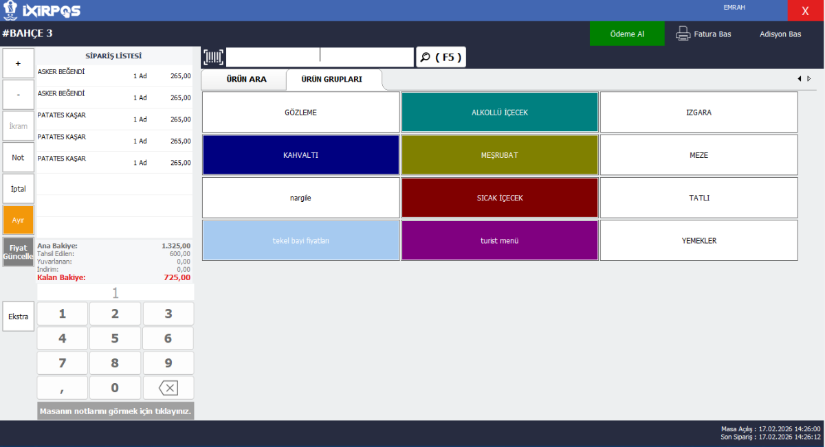 Restoran Adisyon Sistemi ile işletmenizin masa siparişlerini, gel al siparişlerini ve paket siparişlerini kolaylıkla yönetebilirsiniz. Garsonlar mobil uygulama ile siparişleri masada alabilir, doğruca yazıcılara yönlendirilebilir. Reçetelendirme yapısı ile işletmenizde ürettiğiniz ürünlerin stoklarını takip edebilirsiniz.